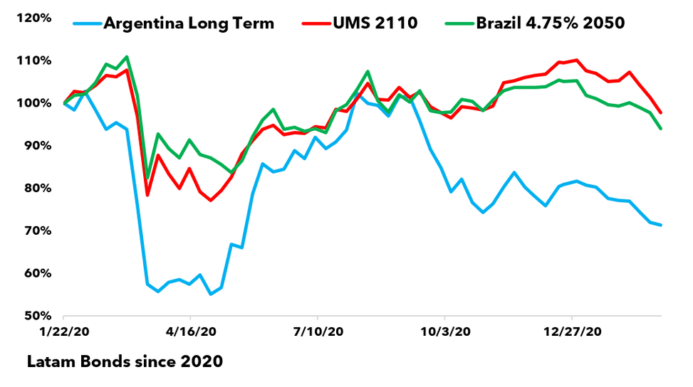 Latam bonds have traded with weakness this year, driven by higher long term US rates. The sell off has recently intensified due to increased inflation in the US and local politics.